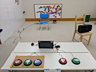 福祉用品の大型押しボタンスイッチを使って、音楽や効果音、照明、プロジェクションマッピング等をコントロールできる演奏システムを開発しています。科学研究費課題番号:22K02536