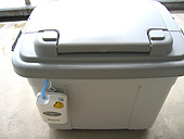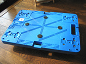 上の写真の容器はゴミ箱としてホームセンターで売っていたものです。容量は45リッターですが、車の振動で揺れても水がこぼれないように、入れる水は30リッター程度にしておく予定です。フタ自体は本体にきっちり固定できるし、フタの中央部分を開くことができるのでろ過フィルターのホースを入れることもできて便利です。写真では、容器の横にドリルで穴を開けて電池式エアポンプを取り付けたところです。電池式のエアポンプは釣具店で売っています。生きエサを釣り場まで運ぶためのグッズです。また、左の写真のような簡単な台車も用意しました。30リッターの水は30kgですから台車がないととても運べません。
