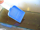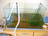朝早く起きて、水槽の解体にかかります。水槽にせよ、バケツにせよ、限られた容積の中で魚が生きていくために最も重要な問題は、魚の排泄するものをいかに無害な物質にして水質の悪化を防ぐか、ということです。水質が悪化してしまうと、魚は死んでしまいます。熱帯魚なので保温も必要ですが、今回は真夏なので、この問題はなし。どちらかというと高温対策のほうが必要なくらいです。