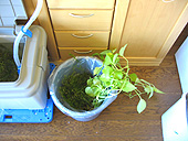 部屋に戻ってちょっと水換えをしました。余計なバケツがなかったので、部屋のゴミ箱にコンビニ袋を入れてバケツ代わりにしました。こういうときのために、ビニール袋をたくさんもってきています。魚たちは全員元気です。強いなあ、こいつらは。
