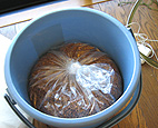 次に底床(底砂)を取り出します。底砂の中にもバクテリアがいるので、気休め程度ですが、一握り、二握りくらいバケツのほうにも入れておきます。それ以外は、水を切って分厚いビニール袋を張った別のバケツに入れていきます。