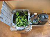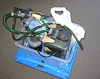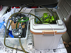 その水質を保つ器具が「ろ過フィルター」です。通常は、これを家庭の電源で24時間動かし続けますが、引越しのときはそうは行きません。そこで、車のバッテリーの直流12Vを交流100Vに返還する機械をカー用品店で買いました。走行中はこれでフィルターを回す予定です。また、その補助に、電池式のエアポンプ(ブクブクと空気を送る機械)も用意してあります。エアポンプの空気の噴出し口に簡単なろ過フィルタをつけることができるので、ろ過の助けにもなります。金魚などはこの程度のフィルターで飼う場合もあるくらいです。