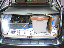 腹ごしらえをしたら、いよいよ水槽を車に積み込む段です。水槽を台車に載せてエレベータで1階に下ろし、車に積み込みます。次に写真のフィルター類を運んで車に乗せます。他にも傷みやすい植木や貴重品など、自分で運ばなければならないものを積んだら、車は満杯です。