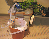 生体をバケツに移したら、ろ過フィルターの給排水ホースを水槽からはずしてバケツのほうに設置します。写真左側のが外部式ろ過フィルターです。この中のろ材にろ過バクテリアが棲みついていて、このバクテリアが水をきれいにしてくれる働きをするのです。