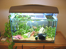 うちの水草水槽です。夜になると蛍光灯の光で水草が光合成を始め、水草の葉についた酸素の泡がきらきら輝きます。「いやし系」のインテリアといったところでしょうか。
